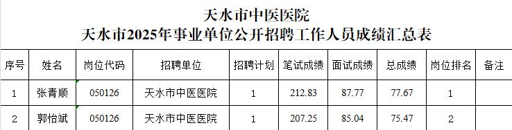 根据天水市人力资源和社会保障局《天水市2025年事业单位公开招聘工作人员公告》、《关于公布天水市2025年事业单位公开招聘工作人员资格复审通过人员名单和面试有关事项的通知》要求,经笔试、面试环节,现将我院2025年度事业单位公开招聘工作人员成绩予以公告。